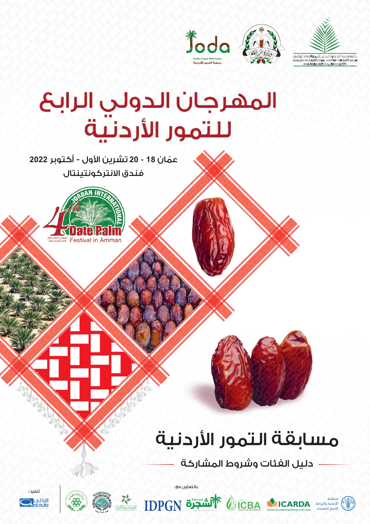 نظم وزارة الزراعة بالمملكة الأردنية الهاشمية (MOA) وجائزة خليفة الدولية لنخيل التمر والابتكار الزراعي (KIADPAI)، وجمعية التمور الاردنية (JODA)، بالعاصمة الأردنية عمّان خلال الفترة 18 - 20 تشرين الثاني / أكتوبر 2024، بالتعاون مع منظمة الأغذية والزراعة للأمم المتحدة (FAO)، المركز الدولي للبحوث في المناطق الجافة (ICARDA) المركز الدولي للزراعة الملحية (ICBA)، المنظمة العربية للتنمية الزراعية (AOAD)، المركز العربي للبحوث الزراعية في المناطق الجافة والأراضي القاحلة (ACSAD)، اتحاد مراكز البحوث الزراعية في الشرق الأوسط وشمال افريقيا (AARINENA) الشبكة الدولية لتطوير زراعة النخيل وإنتاج التمور في الشرق الأوسط وشمال افريقيا (IDPGN) وجمعية أصدقاء النخلة بالإمارات (DPFS).