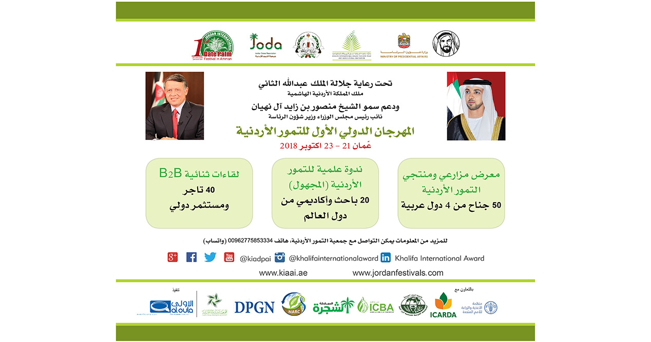 تحت رعاية جلالة الملك عبدالله الثاني ملك المملكة الأردنية الهاشمية وبمكرمة من سمو الشيخ منصور بن زايد آل نهيان نائب رئيس مجلس الوزراء وزير المتحدة، تنظم جائزة خليفة الدولية لنخيل التمر والابتكار الزراعي ووزارة الزراعة في المملكة الأردنية الهاشمية وجمعية التمور الأردنية المهرجان .