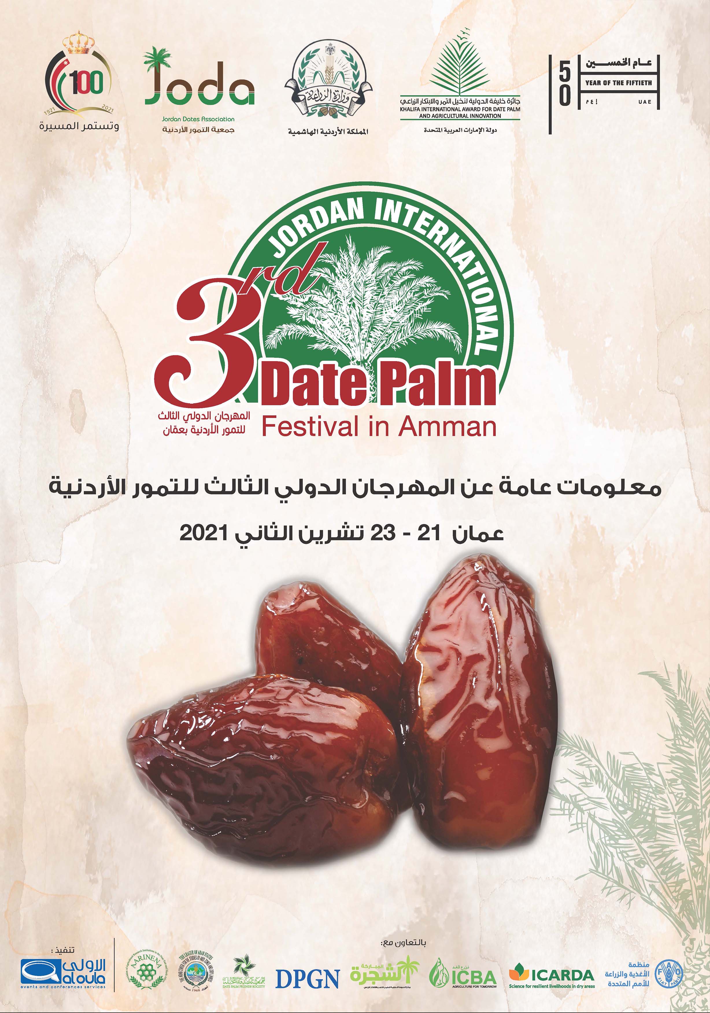 ضمن هذه الرؤية الواعدة تأتي مبادرة الجائزة وزارة الزراعة بالمملكة الأردنية الهاشمية (MOA) وجائزة خليفة الدولية لنخيل التمر والابتكار الزراعي ، وجمعية التمور الاردنية (JODA)،المهرجان الدولي الثالث للتمور الأردنية بعمّان خلال الفترة 21-23 تشرين الثاني / نوفمبر 2021، بالتعاون مع منظمة الأغذية والزراعة (FAO) والمركز الدولي للبحوث الزراعية في المناطق الجافة (ICARDA)، والمركز الدولي للزراعة الملحية (ICBA)، المركز العربي لدراسات المناطق الجافة والأراضي القاحلة (أكساد) ، اتحاد مؤسسات البحوث الزراعية في الشرق الأدنى وشمال إفريقيا (أرينينا ) والشبكة الدولية لنخيل التمر (DPGN)، وجمعية أصدقاء النخلة بالإمارات (DPFS).الذي يشمل ضمن فعالياته إطلاق مسابقة للتمور الأردنية لتحفيز وتكريم المزارعين من أصحاب أجود أنواع التمور الأردنية المنتجة في مناطق الأردن المختلفة، علماً بأن باب المشاركة مفتوحاً لكافة مزارعي ومنتجي ومصنعي التمور على مستوى المملكة الأردنية الهاشمية.