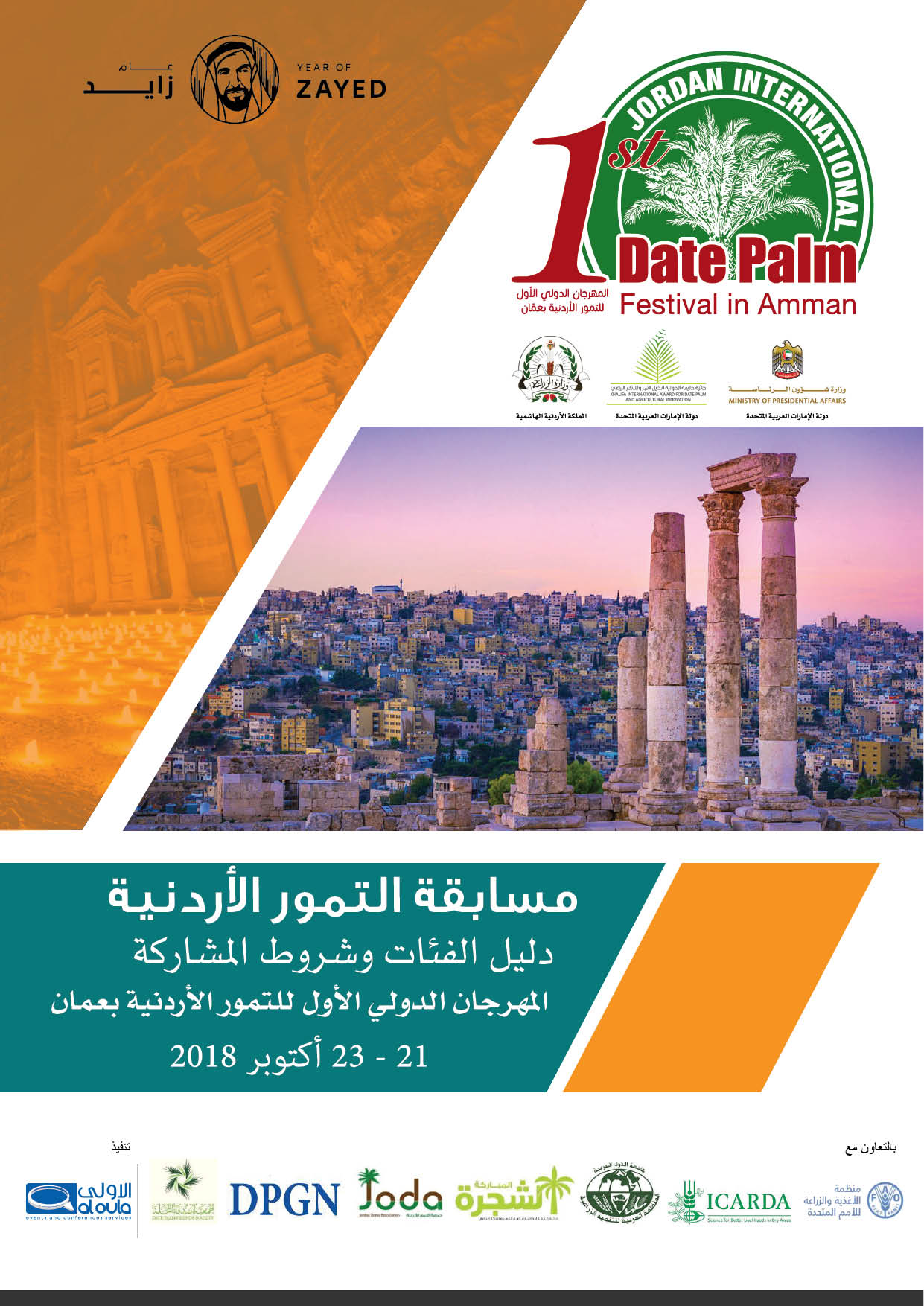 A number of strategic partners and international organizations such as Ministry of Agriculture in the Hashemite Kingdom of Jordan (MOA), Jordan Dates Association (JODA), FAO, the International Center for Agricultural Research in the Dry Areas (ICARDA), the Arab Organization for Agricultural Development (AOAD), Date Palm Global Network (DPNG), the Date Palm Friends Society of the UAE (DFS), international organizations operating in the Kingdom and local civil society institutions, along with research and excellence centers and Greater Amman Municipality will be participate in the First International Festival of Jordanian dates 2018.