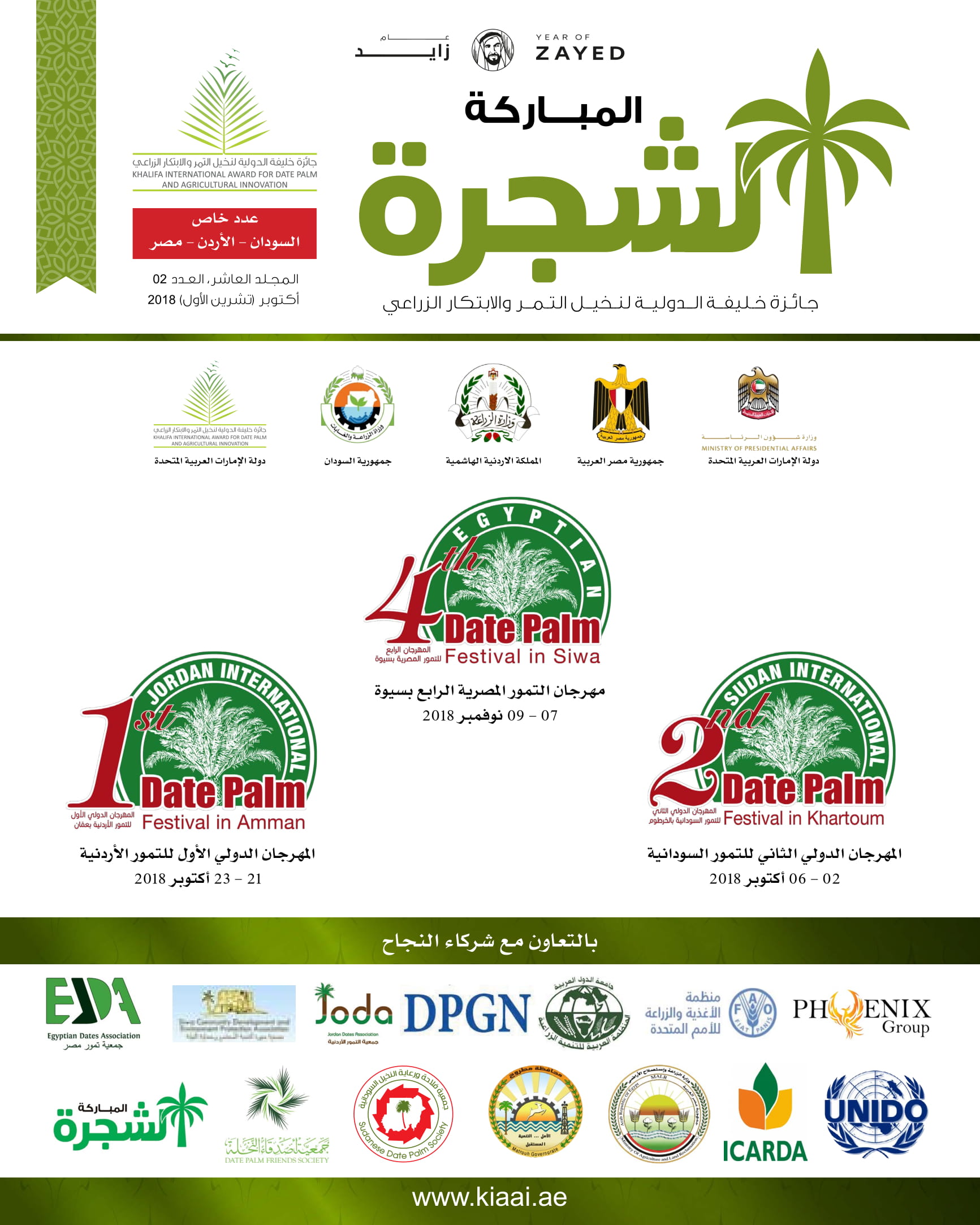 The General Secretariat of the Khalifa International Award for Date Palm and Agricultural Innovation is working on issuing a special issue of the Blessed Tree magazine, including a collection of research and scientific studies related to the First International Festival of Jordanian Dates 2018 with the participation of a number of researchers and academics specialized in palm cultivation and dates production at the Arab and international levels. The special issue of "the Blessed Tree magazine" will be distributed to all participants in the event.