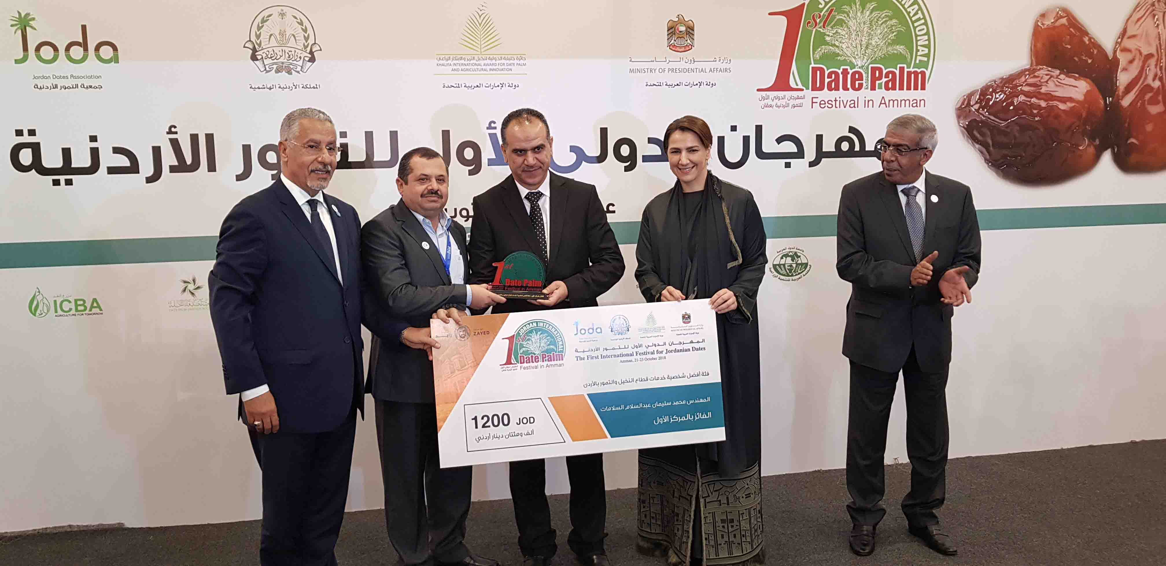 شهد معالي المهندس إبراهيم الشحاحدة مندوب راعي المهرجان جلالة الملك عبد الله الثاني حفظه الله، ومعالي مريم بنت محمد المهيري وزيرة دولة للأمن الغذائي المستقبلي بالإمارات وسعادة سيف مطر الشامسي سفير دولة الامارات العربية المتحدة بعمان، وسعادة الدكتور عبد الوهاب زايد أمين عام جائزة خليفة الدولية لنخيل التمر والابتكار الزراعي خلال حفل افتتاح المهرجان الدولي الأول للتمور الأردنية بعمان 21 أكتوبر 2018 تكريم الفائزين بمسابقة التمور الأردنية في دورتها الأولى وكانت النتائج على النحو التالي: